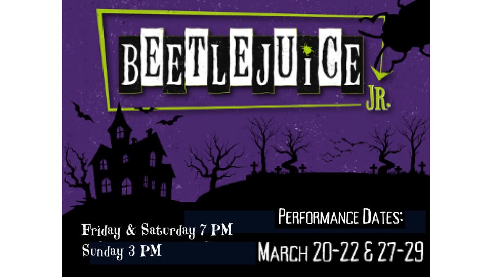 The ghost-with-the-most comes to the stage in Beetlejuice JR., the frightfully funny musical based on the beloved motion picture turned Broadway phenomenon. Lydia Deetz is a strange and unusual teenager, still grieving the loss of her mother and obsessed with the whole “being dead thing.” Lucky for Lydia, she and her father move to a new house haunted by a recently deceased couple and Beetlejuice, a delightful demon with a real zest for life. When Lydia calls on Beetlejuice to scare away anyone with a pulse, this double-crossing specter shows his true stripes, unleashing a (Nether)world of pandemonium.