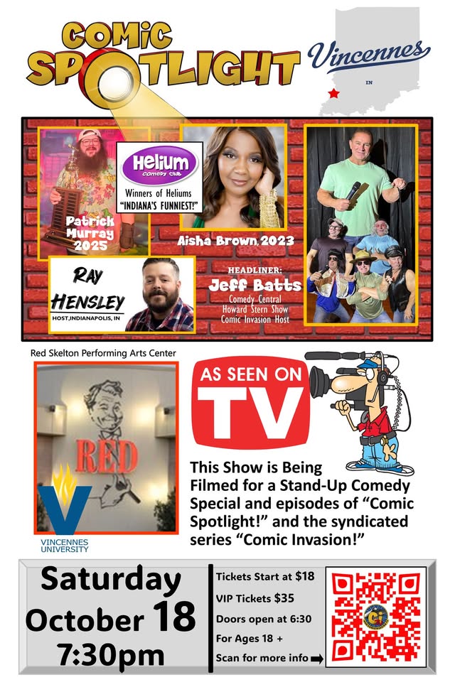 VINCENNES AREA COMEDY FANS!! Live Comedy is coming to THE RED SKELTON THEATER! We are bringing out the TV cameras filming segments for Season #2 of “Comic Invasion!” and the new spin-off series “Comic Spotlight!”. 4-National Touring Comedians including ’23 & 25′ winners of HELIUM COMEDY CLUB’s Funniest in Indiana Winners AISHA BROWN and PATRICK MURRAY + Emcee Comic RAY HENSLEY and National Touring Headliner and TV Host JEFF BATTS! BE A PART OF THE STUDIO AUDIENCE!